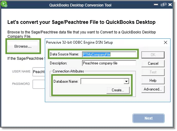 After you have set up credentials for data access, go through the following step to choose the Sage company file for the Peachtree to QuickBooks conversion tool.